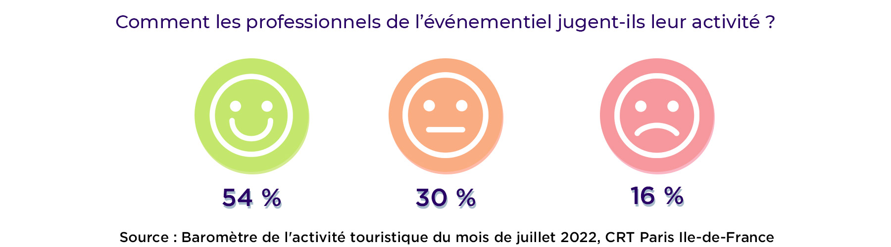 - Pour illustration, plus d’un acteur du secteur sur deux juge l’activité générée par les événements professionnels comme bonne ; taux en hausse de 86% en comparaison avec juillet 2021.