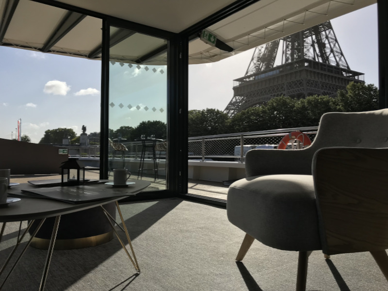 Les différents espaces sont répartis sur deux autres niveaux, dont le pont principal entièrement vitré, offrant ainsi un panorama irremplaçable dans un cadre de rêve. Le pont principal est équipé d’une salle entièrement vitrée avec une vue imprenable sur la Tour Eiffel, la Seine et le Trocadéro. Doté de plusieurs espaces extérieurs, une salle attenante de 30m² aménageable en lounge ou en salle de sous-commission, ainsi que d’un local traiteur, cet espace est idéal pour les repas assis, réunions, dégustations, cocktails ou tout autre événement.